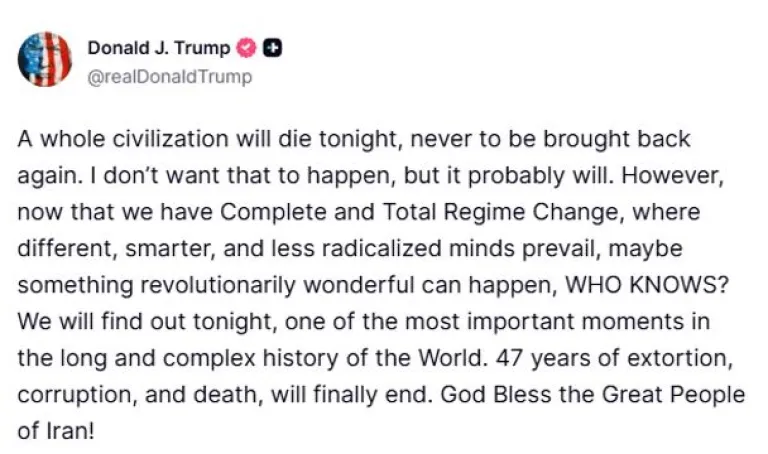"Esta noche morirá toda una civilización", manifestó el presidente estadounidense por redes sociales, tras el ultimátum que le dio al régimen para finalizar el conflicto bélico.