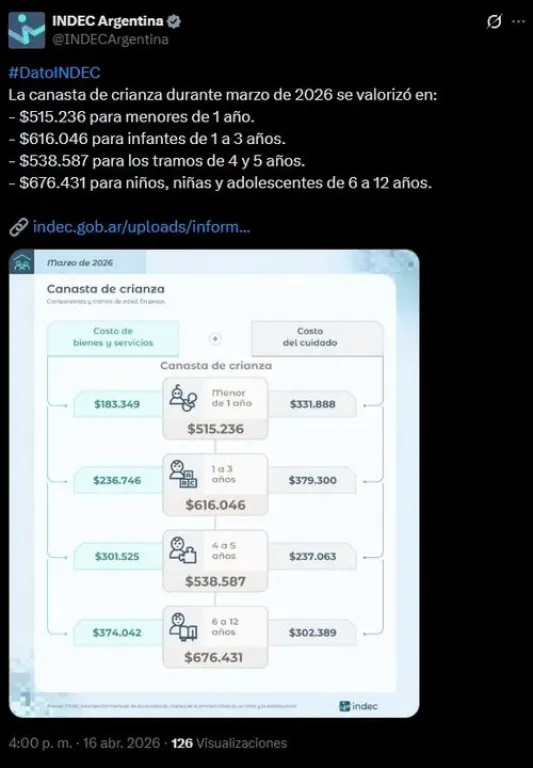 A su vez, el informe oficial, en sus detalles, marca que la canasta de crianza contempla dos componentes principales: el costo de los bienes y servicios necesarios para el desarrollo de los niños y el valor económico del tiempo destinado a su cuidado.
